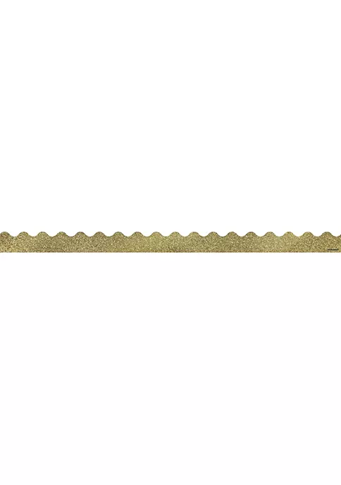 Give your plain bulletin board displays some personality with Carson Delossa trim! This scalloped border features allover glittered sparkle in a gold hue. This pack includes 13 strips, each measuring 3 feet x 2-1/4 inches for a total length of 39 feet. FeaturesScalloped BordersScalloped border tacks, pins, glues, or tapes with ease onto boards, paper, cork, and moreFun design is perfect for Grades PreK to 8 (ages 4 to 14) in classrooms, hallways, a daycare, or kid-friendly office sectionsBright, eye-catching look instantly grabs attentionSeparate 3-foot long strips allow you to make custom-length cuts for layering or other creative displays13 StripsIncludes:13 Border StripsSpecificationsColor: Gold GlitterSize: 3′ x 2.25″Country of Origin: United StatesGrade Level: Teacher-Parent ResourcesSafety: No Choking HazardAllergens: Contains No AllergensMaterial: PaperLength: 39′