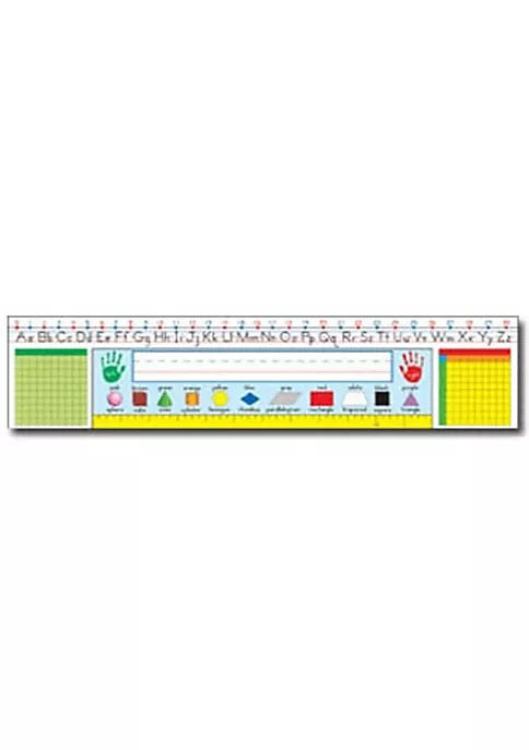 Nameplate includes: a name line; manuscript alphabet (upper- and lowercase) with stroke lines; 030 number line; 11 shapes shape names and colors (shapes follow many states math standards); left- and right-hand icons; 12 inch ruler; a hundreds board; and addition chart with facts 1+1 through 9+9. There are 36 reference nameplates per pack; each measures 18 inches x 4 inches.