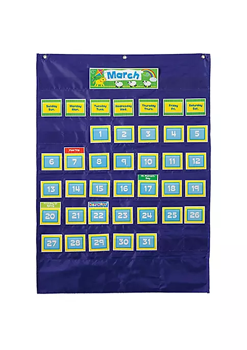 Help students learn about the days of the week and months of the year with this engaging pocket chart. It includes 100 cards including days of the week, months of the year, calendar cover-ups, and holidays! 43 clear pockets- 2 storage pockets with hook-and-loop tape closure- Monthly headers, days of the week, date, holiday and special day cards- 25″ x 35″