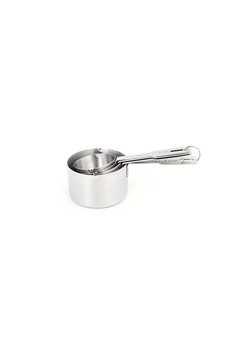 This Set of Four Measuring Cups are made of durable 18/8 stainless steel for long-lasting use. The set includes: 1/4 cup, 1/3 cup, 1/2 cup and 1 cup measurers, giving you precise measurements at whatever amount you need. The measurements are conveniently engraved into the metal, so they won’t wash off! Due to their sturdiness, they won’t tip over when sitting on your countertop. The cups are fastened together with a connector ring and are easily stackable when not in use for fantastic, space-saving storage. Just the right cups to give you just the right amount!