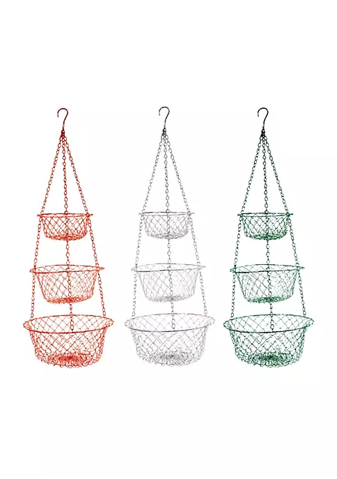 Keep fruits and veggies handy with these beautiful hanging baskets! This classic kitchen organizer is the ultimate in space-efficiency, taking up no counter space and instead hanging conveniently from the ceiling. The three tier hanging design allows additional storage and easy access to the stored contents. Constructed of iron with colored plastic coatings, this 3-piece set includes red, white and green baskets. Great for wherever you find yourself wishing for more space, including the kitchen, kids’ rooms, closets, laundry room, garage or bathroom! Basket diameters measure from 7-inch to 11-inch, and extends to a total height of 32-inches. No assembly required! These attractive storage pieces can be hung up right away. Perfect for sorting and organizing produce, vegetables, craft supplies, and more. Add space, prevent cluttering, and maximize your storage abilities, while adding a touch of charm to your home.