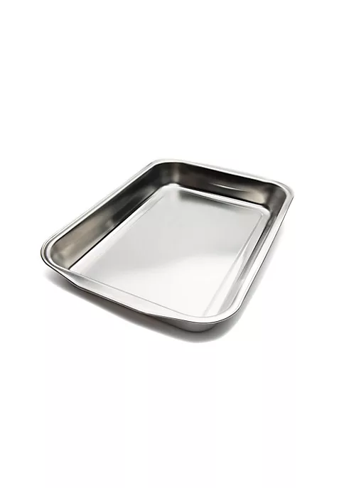 Bake scrumptious treats with this Roasting Pan. Our beautifully crafted stainless steel bakeware features a stain, scratch, and rust resistant surface that will not warp or corrode, but will preserve its elegant shine over time. Having the ability to withstand extreme temperatures and heavy scrubbing, this non-reactive and nonporous pan will provide for years of safe and successful baking. Its size makes it perfect for toasting an array of tasty nuts, roasting a succulent selection of veggies, or baking a batch of your favorite bar cookies. Best of all, leftover food particles will wash off effortlessly. For perfect, even browning, bake Fox Run.